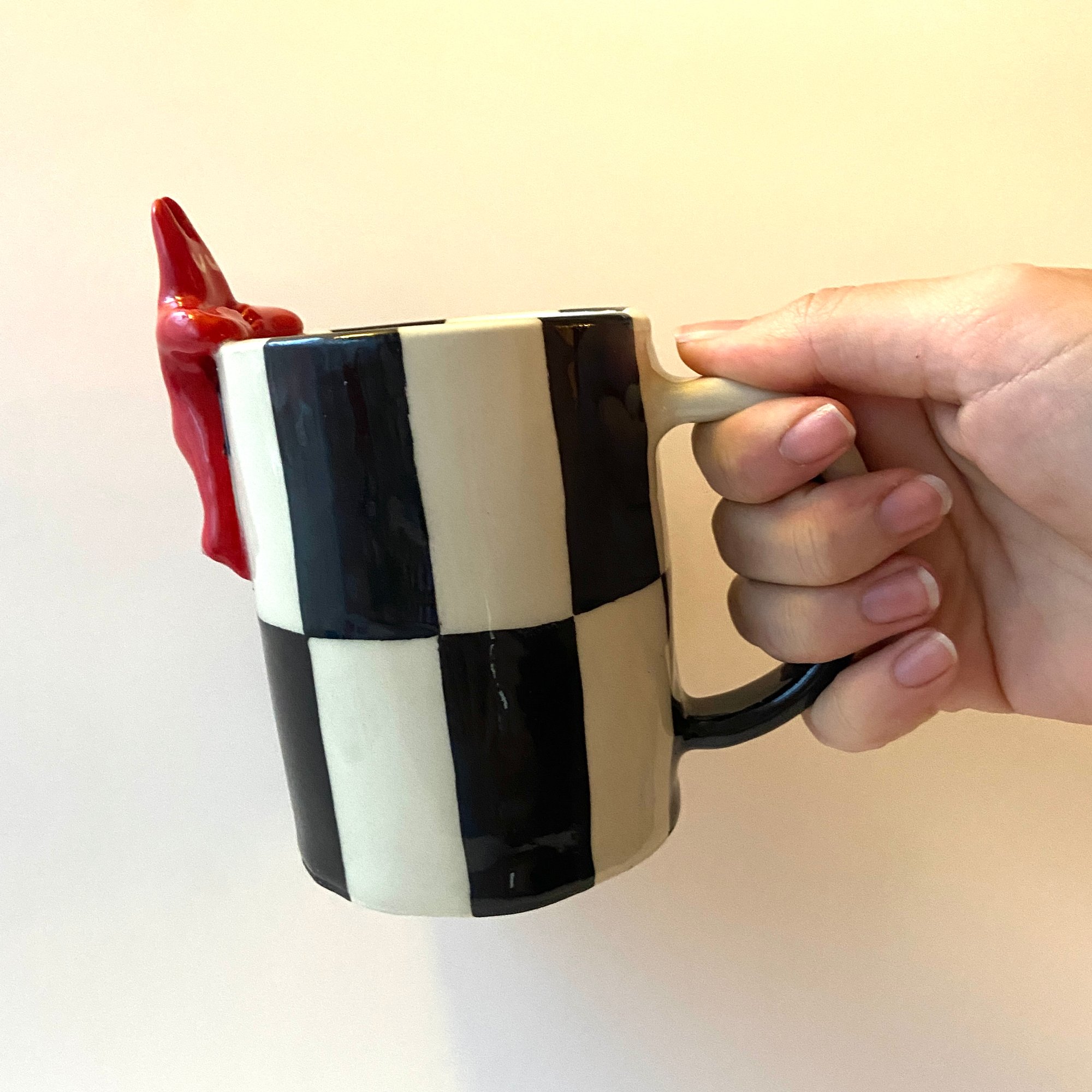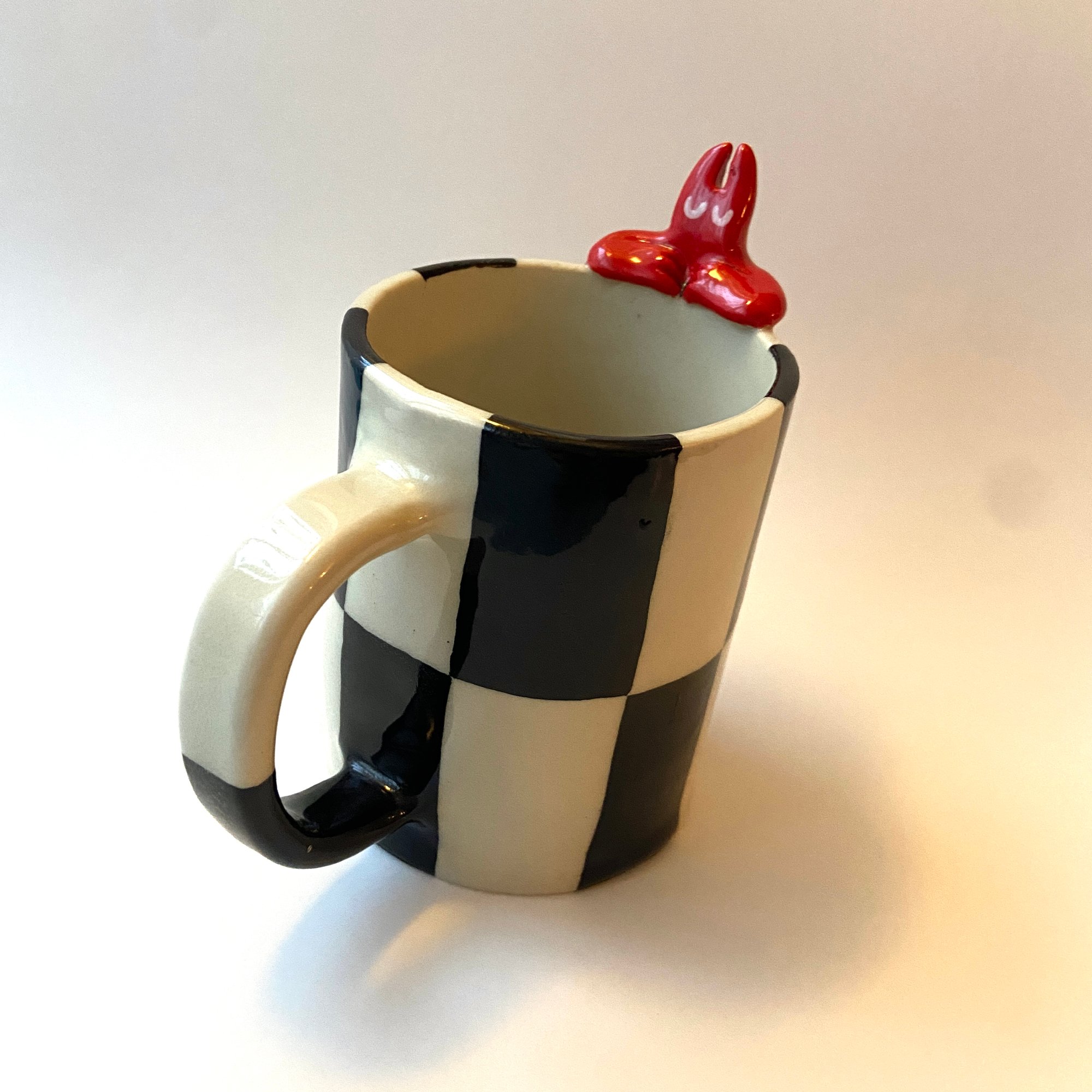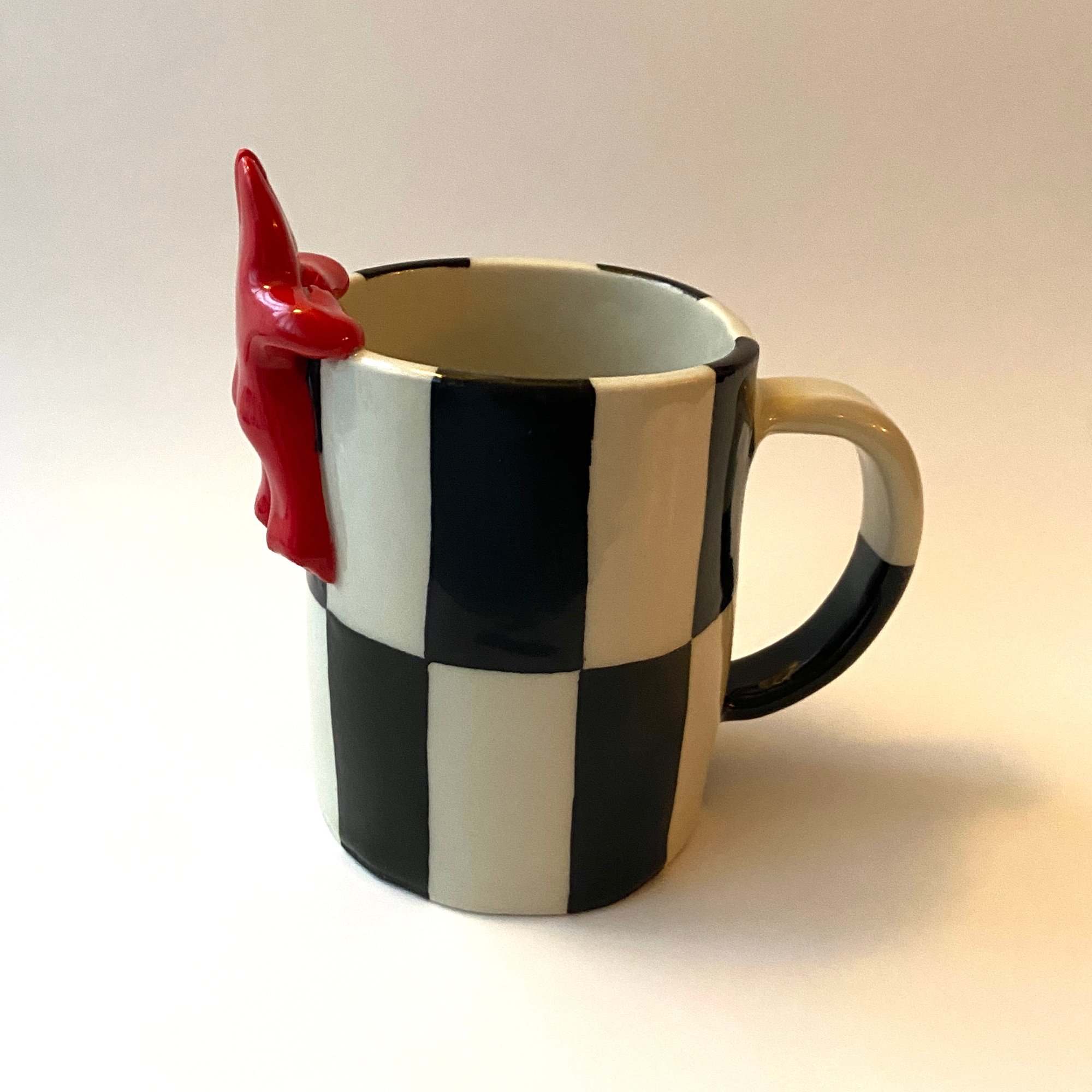 Ceramic mug with a cheeky little devil peeking over the edge, bringing a little whimsy to your morning coffee <3